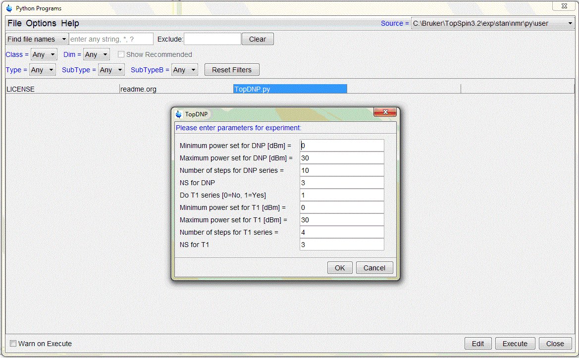 You should download this whole package from the Github repository and extract it in the path C:\Bruker\TopSpin3.2\exp\stan\nmr\py\user\ which puts TopDNP.py in the right folder for TopSpin. Then the parameters on the top of TopDNP.py should be adjusted to match the setup. The rest of the experiment variables will be asked during the experiment. Also make sure you have Python 2.7 and package Pyserial installed.