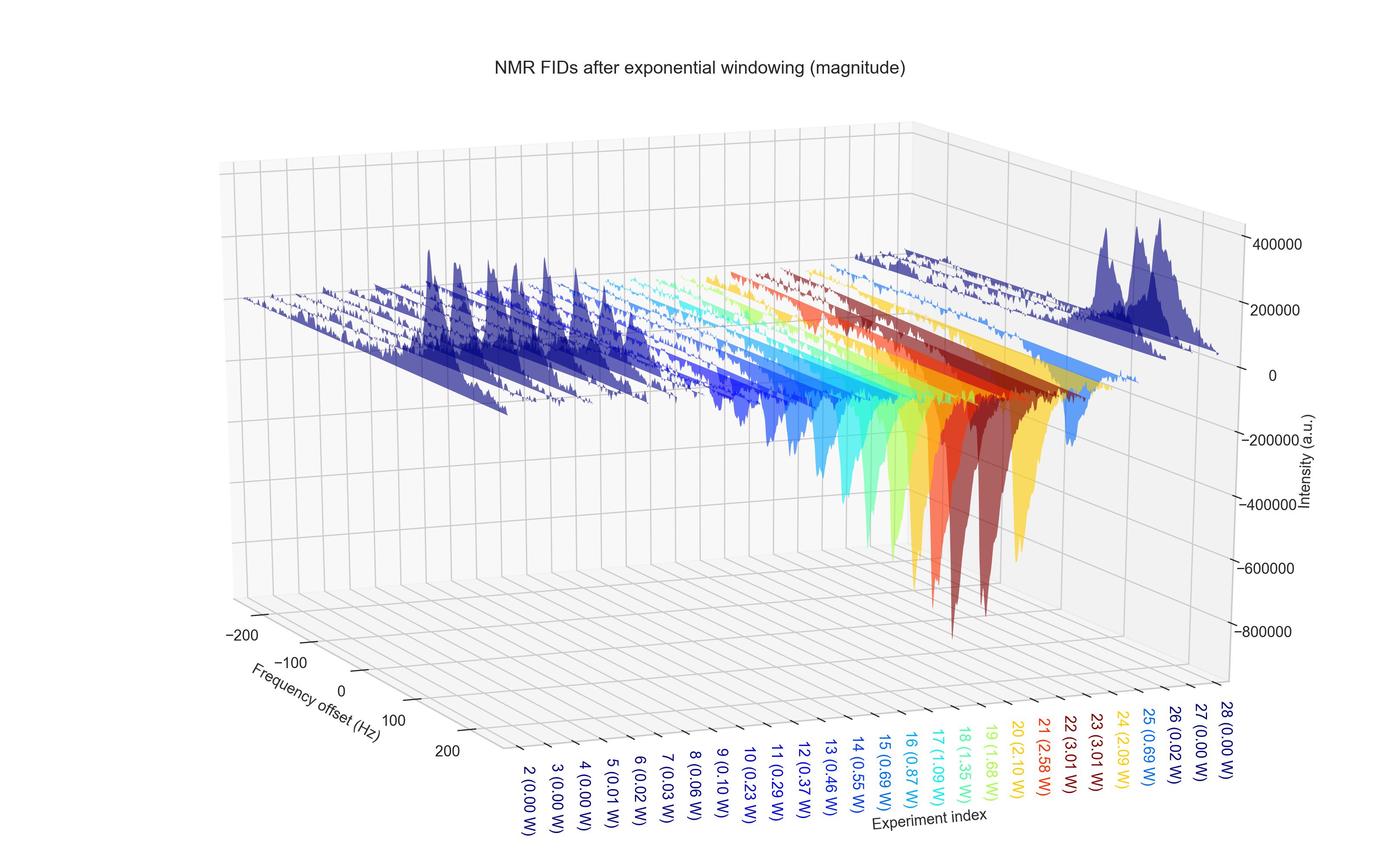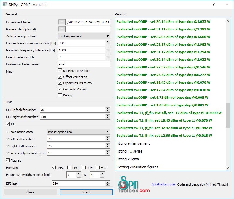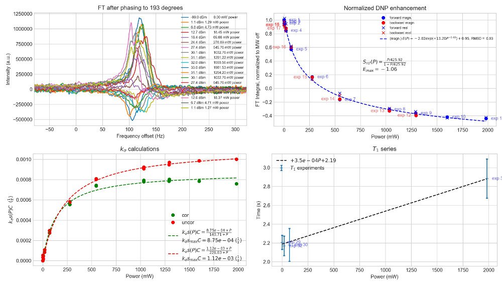 path = '/path/to/exp/folder/' powerFile = 'powers' kwargs = { 't1Calc': 'PCreal', # 'PCreal' for real phase cycled channel or 'PCmagn' or 'real' or 'magn' 'phase': 'first', # all, none, first 'ftWindow': 200, # X domain for FT plot, int. and phase calculation 'maxWin': 1000, # Does not allow peaks out of this domain to be calculated in int. 'lS': 70, # Left shift points or 'auto' 'lSt1': 70, # LS for t1 experiments (this differs from DNP sometimes) 'rS': 110, # Right shift points 'rSt1': 75, 'lB': 2, # Line boradening [Hz] 'offCor': True, # offset correctioon 'basCor': True, # baseline correction 'evalPath': 'evalHadiTest', 'plotDpi': 250, # plot file resolution 'plotExts': [], # remove all if you do not want plots to be saved 'process': True, 'debug': False, 'dumpToCsv': True, 'figSize': (13, 8), 'powerFile': powerFile, 't1SeriesEval': True, 't1SeriesPolDeg': 1, # Polynomial degree for T1 series fit (default = 1) 'kSigmaCalc': True, }